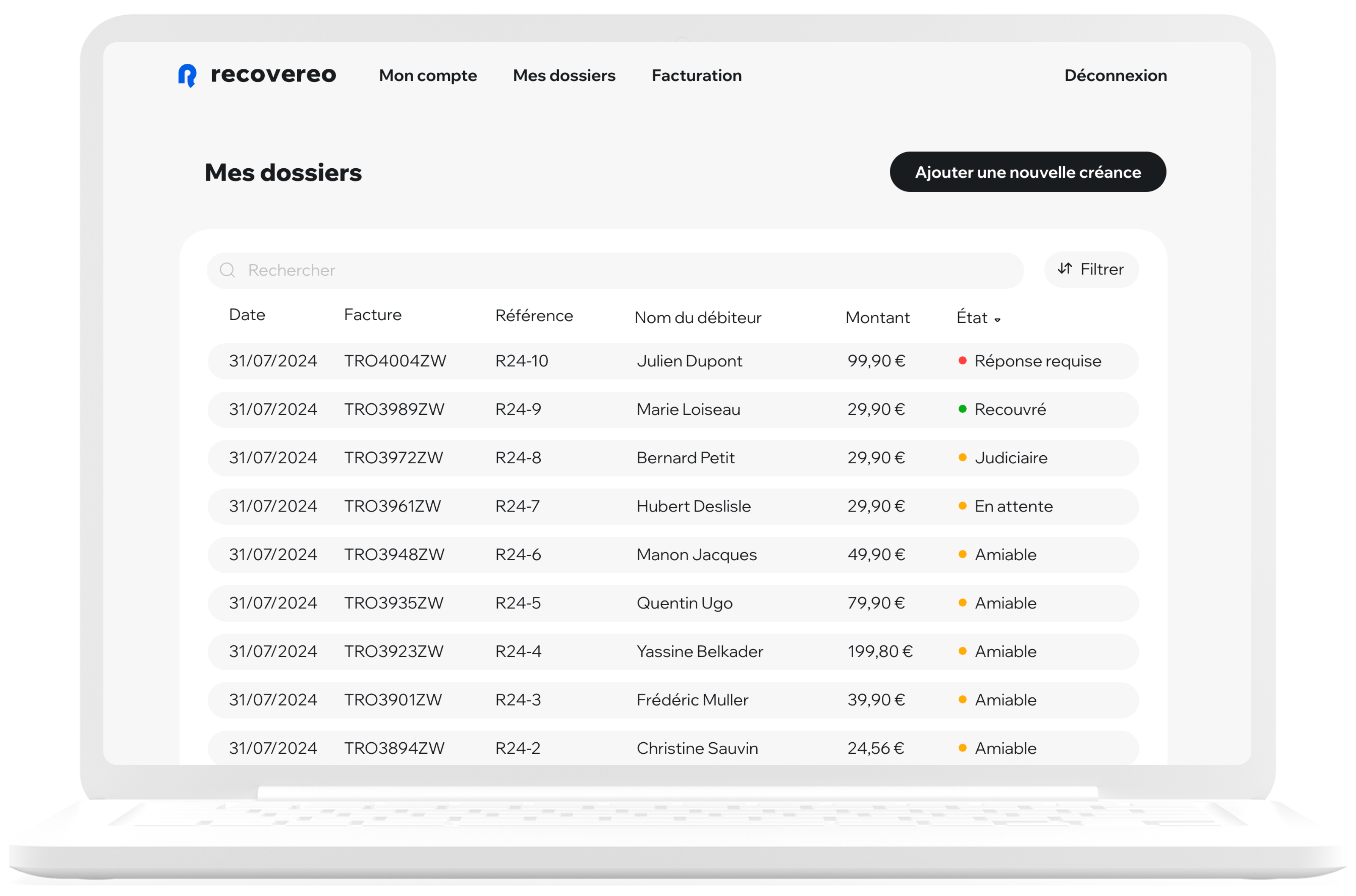 Une fois inscrits, les utilisateurs peuvent facilement uploader leurs créances via l’interface intuitive de Recovereo. Il leur suffit de soumettre les informations liées aux dettes qu’ils souhaitent recouvrir, et nous prenons en charge l’intégralité du processus. Nous commençons par envoyer des rappels par e-mail pour notifier les débiteurs, et si nécessaire, nous poursuivons l’action en justice pour assurer le recouvrement des fonds. Le tout se fait sans frais initiaux pour les utilisateurs, garantissant un service sans risque jusqu’à la récupération.